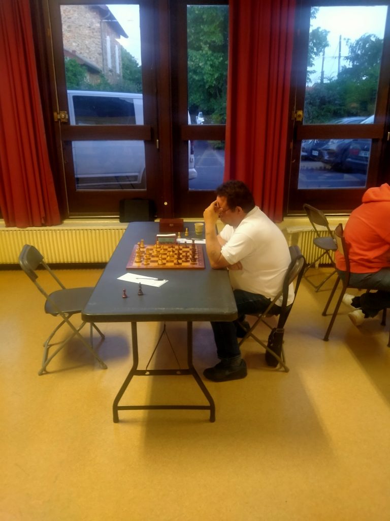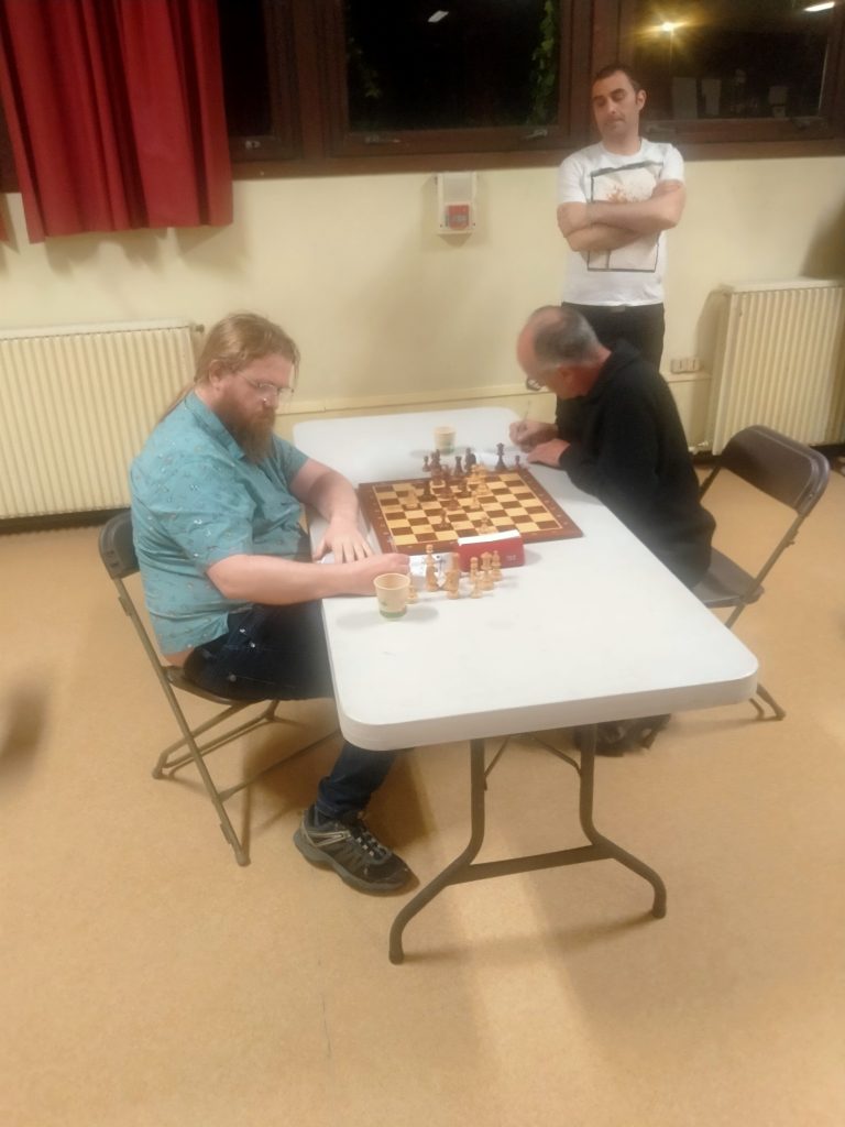 Hugo, notre remplaçant de dernière minute, (pas l’ado qui joue tout à tempo et qui perd tout le temps mais un adulte qui gagne la plupart du temps) tombe contre un joueur à sa portée. Il ne fait pas une bonne ouverture et le milieu de jeu est trop dur, il finit donc par s’incliner… Ca commence mal… 0-3