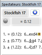 Finalement il peut récupérer une Tour mais il doit tout échanger et se retrouver avec un Cavalier de moins… Devant ce choix il accepte le deal mais récupère 1 pion dans sa besace. On sent que son adversaire patauge un peu dans la semoule et se met mal au temps. Pascal a 2 pions pour la pièce mais ça semble encore un peu juste.