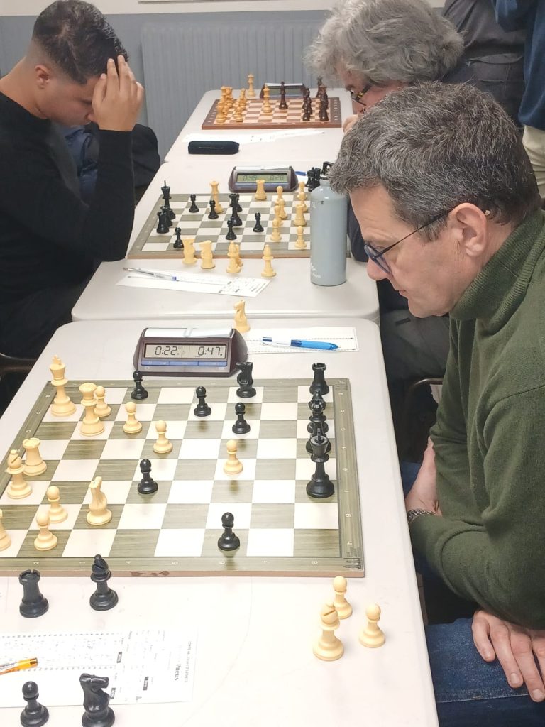 Je me retourne, mais qui vois-je dans la salle ? La légende vivante des échecs du Val-d’Oise : Philippe Pierlot ! 😎 ! Il est passé juste après son match à Conflans, ça fait toujours plaisir de le voir !