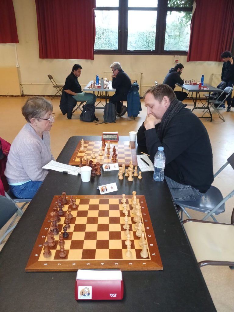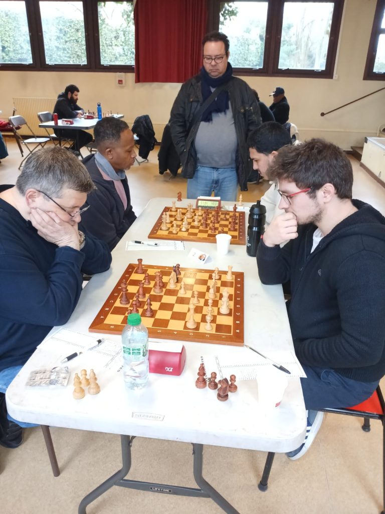 Michel perd une pièce dans l’ouverture contre 2 pions mais ses pions sont fixés sur la mauvaise couleur et il ne peut pas profiter de leur mobilité ! Il finira par tout échanger et faire nul ! 4-0