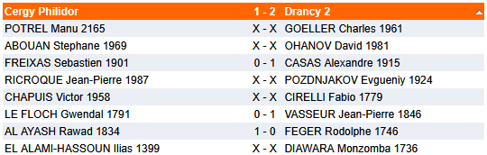 J-P joue Evgueniy POZDNJAKOV, un ancien joueur à 2250 qui a maintenant 72 ans et qui n’est « que 1924 », le genre de joueur dont il faut se méfier. C’est impressionnant car il a exactement la même tête qu’il y a 25 ans, comme quoi le foot et le badminton ça conserve ! La partie commence et J-P se retrouve très mal sans raison dans une position hyper connue. Il trouve des ressources avec Df4 suivi de e5, ça sent que ça ne fonctionne pas mais il arrive à l’embrouiller et fait nul ! Ouf ! 0-1